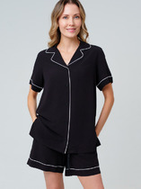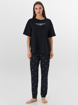 Пижама для дома из трикотажного полотна.Футболка прямого кроя, округлая горловина с обтачкой.По переду, спинке рез.Короткий втачной рукав.Спереди принт,нашивка.Бриджы с поясом на внутренней резинке с киперной лентой. Боковые карманы с отрезным бочком.