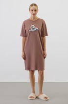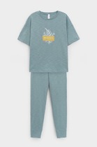 Пижама для дома.Футболка из трикотажного полотна. Округлая горловина с обтачкой. Втачной короткий рукав. Сзади средний шов.Спереди принт, нашивка.Шорты длинные, облегающие из трикотажного полотна кашкорсе.По талии притачная резинка жаккард, нашивка.