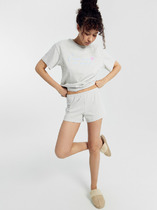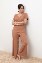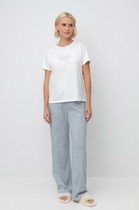 Набор одежды из хлопкового трикотажного полотна с модалом. Футболка прямого кроя. Короткий спущенный рукав. По горловине обтачка с кружевом. Спереди нашивка, сзади принт. Брюки прямые с поясом на внутренней резинке. По боковым швам узкое кружево, 2 ряда.