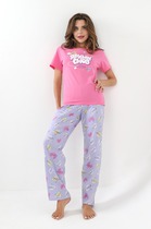 Пижама для дома из хлопкового трикотажного полотна. Майка на узких бретелях. По горловине переда обтачка с кружевом, бант.Отрезной лиф со сборкой. По пройме окантовка. По низу изделия мелкий оверлок. Короткие шорты с поясом на резинке. По низу шорт рюша.