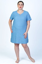 Платье для дома и отдыха прямого силуэта из хлопкового трикотажного полотна. Застёжка на пуговицы, отложной воротник с лацканами. Втачной короткий рукав, внизу с контрастным кантом. Спереди накладной карман с контрастным кантом. Боковые разрезы.