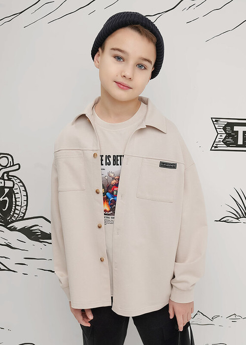 Уютная рубашка для мальчика из мягкого футера. Стильные накладные карманы украшены декоративной нашивкой, добавляющей изделию индивидуальности. Комфортная посадка и современный дизайн делают эту модель идеальной для повседневной носки.