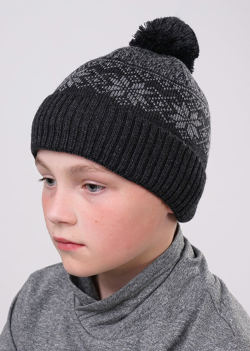 Детская шапка с отворотом на флисовом подкладе, выполнена жаккардовым переплетением, декорирована ниточным помпоном и светоотражающей нашивкой в затылочном шве.