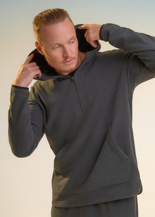 Мужская толстовка выполнена из флиса. Модель с укороченной застежкой на молнию и вместительным карманом, так же дополнена имиджевой вышивкой. Прекрасно подойдёт для холодного времени года.