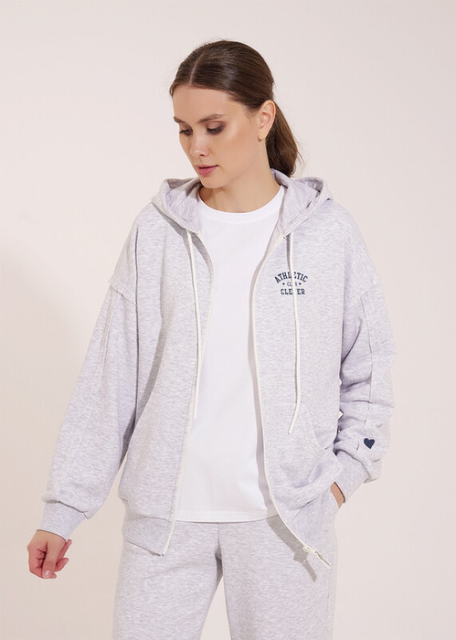 Куртка спортивная из трикотажного полотна футер,на молнии. По горловине капюшон на подкладе со шнуром. Длинный рукав со спущенной линией плеча, нашивка.По низу рукава и изделия манжеты. Спереди карман кенгуру, принт.По пройме и шву рукава открытый срез.