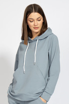 Куртка спортивная из трикотажного полотна футер с начесом, свободного кроя на молнии с капюшоном на подкладе и шнуром. Длинный рукав со спущенной линией плеча. По переду резы с карманами в швах. По низу рукава и изделия манжет. Спереди принт.