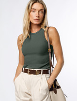 Майка-топ укороченная из трикотажного полотна рибана, полиэстер с эластаном. Бретели из шляпного шнура. Деталь переда двойная.