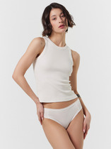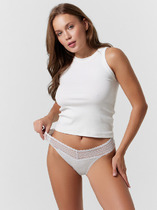 Бикини, комбинированная модель из хлопкового полотна с эластаном и эластичной сетки.На детали переда-фигурный рез, линия которого переходит на спинку.Линии реза и деталь переда декорированы узким кружевом.По талии-ажурная резинка, по ножке-полуокантовка