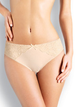 Трусы бразилиана женские из эластичного хлопкового полотна. Обработка краев по талии - ажурная резинка, по ноге - подгибка. По переду атласный бант.