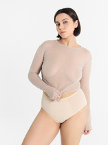 Трусы бразилиана с завышенной посадкой, сзади и сбоку бесшовная гладкая обработка, спереди декоративные горизонтальные вставки из плотной сетки, перед дублирован сеткой, по талии обработка с зигзагом и узкой резинкой
