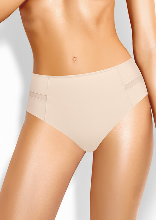 Трусы бразилиана с завышенной посадкой, сзади и сбоку бесшовная гладкая обработка, спереди декоративные горизонтальные вставки из плотной сетки, перед дублирован сеткой, по талии обработка с зигзагом и узкой резинкой