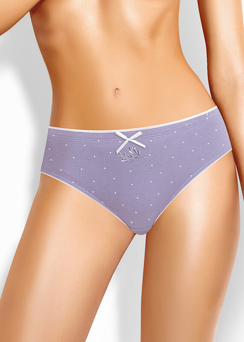 Трусы слипы женские из плотного эластичного хлопкового полотна. Обработка краев по талии - резинка с кантом, по ноге - окантовка. По переду принт и атласный бант.