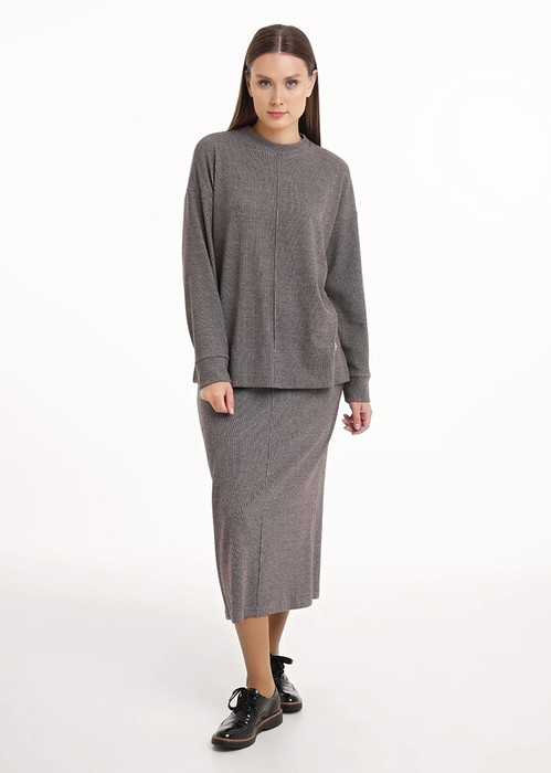 Юбка миди прямого силуэта из трикотажного полотна рибана с вискозой. По талии притачной пояс на внутренней резинке. На детали переда вертикальный защип. На спинке средний шов, внизу разрез.