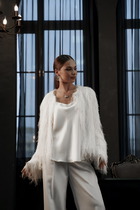 Вязаный жакет из вискозной пряжи с добавлением акрила, свободного силуэта на молнии переплетения гладь. По горловине отложной воротник. Длинный втачной рукав. По низу изделия и рукавов манжеты. По воротнику и манжетам ластичное переплетение.