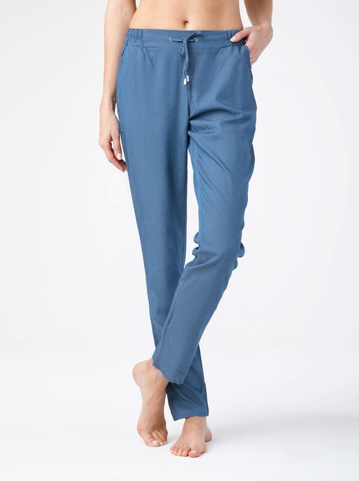 Брюки женские из однотонного текстильного материала "эффект джинс" свободного покроя с карманами. Низ изделия обработан швом в подгибку. Верхний срез изделия обработан притачным поясом с резинкой по спинке и узкими завязками, вставленными по переду в люверсы.