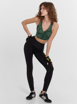 Леггинсы женские жаккардовые облегающие из трикотажного полотна с боковыми швами. По переду изделия - имитация 2-х прорезных карманов "в рамку" с молниями. По боковым швам настрочены отделочные кожаные канты. Гульфик застегивается на застежку-молнию. Верх изделия обработан притачным поясом со шлевками из отделочного кожаного полотна, который застегивается на одну петлю и пуговицу.