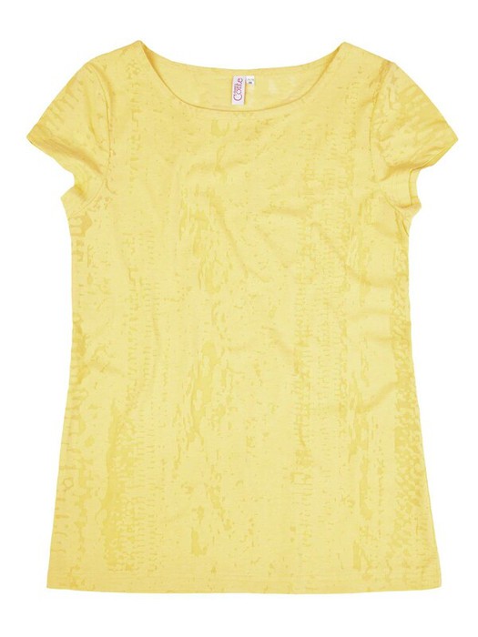 Джемпер женский из однотонного трикотажного полотна с эффектом "вытравка" с коротким втачным рукавом. Круглая головина изделия окантована бейкой.