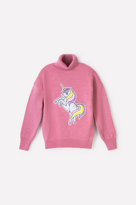 Теплый вязанный джемпер из полушерстяной пряжи в состав которой входит шерсть австралийского мериноса. У изделия спущенные плечи, высокий эластичный воротник. Манжеты и низ изделия связаны ластиком.