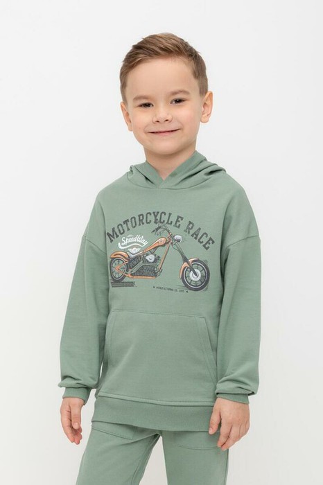 Толстовка с капюшоном для мальчика из петельчатого футера . Манжеты и пояс из эластичного трикотажа в рубчик. Спереди удобный карман-кенгуру.