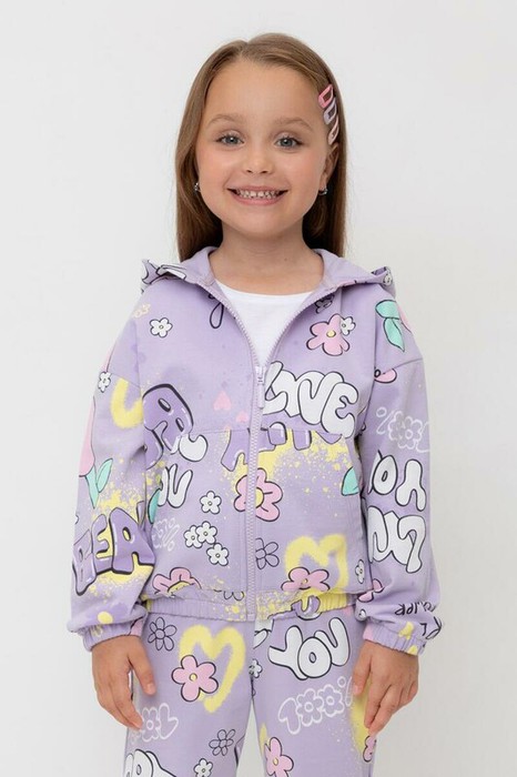 Трикотажная толстовка с капюшоном для девочки из мягкого набивного футера петли. Модель застёгивается на молнию, спереди два кармана. Пояс и манжеты на резинке.