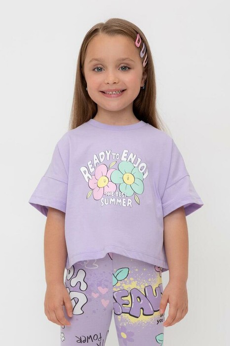 Футболка укороченная для девочки из высококачественного трикотажного полотна. Оригинальный принт выполнен из стойких текстильных гипоаллергенных красителей. Для удобства одевания на спинке в размерах 92 и 98 есть застежка на кнопки.