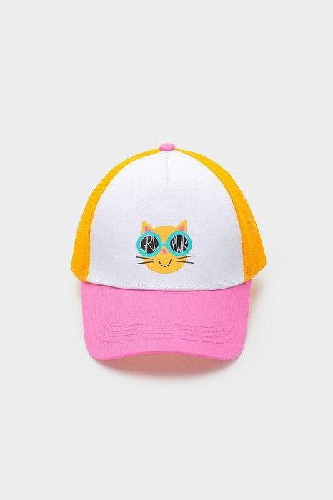 Кепка для девочки из текстиля и сетки. Спереди оригинальный принт. Регулируется по ширине и фиксируется на затылке с помощью пластиковой застежки.