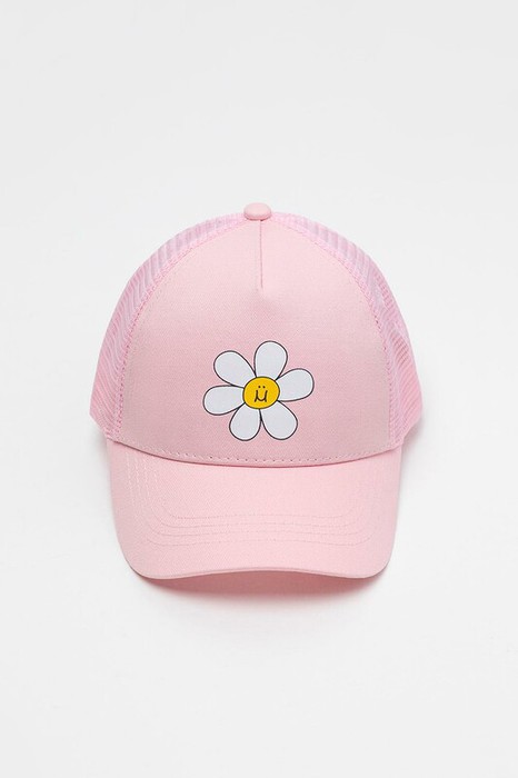 Кепка для девочки из текстиля и сетки. Спереди оригинальный принт. Регулируется по ширине и фиксируется на затылке с помощью пластиковой застежки.