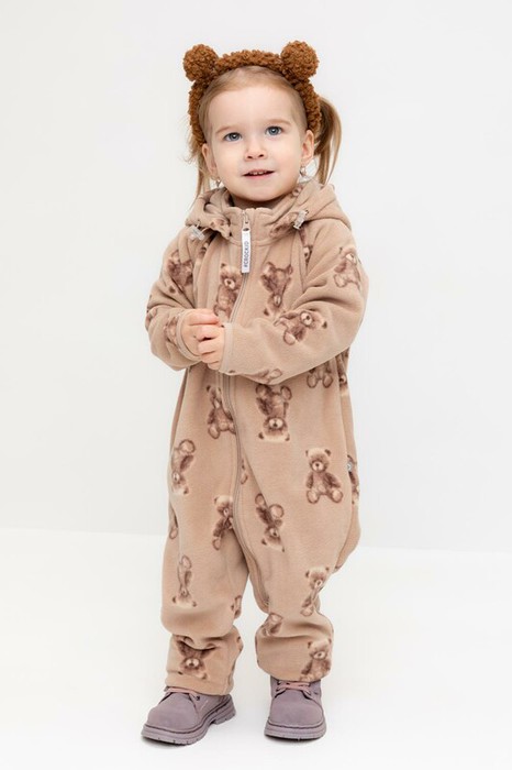 Флисовый комбинезон со съёмным капюшоном для девочки. У изделия высокий воротник и съёмный капюшон на кнопках. Застёгивается на удлинённую молнию. Предусмотрена защита шеи и подбородка. На рукавах и штанинах есть удобные отвороты. Оригинальная набивка выполнена из стойких, гипоаллергенных текстильных красителей. Комбинезон сохраняет цвет и форму после многократных стирок.