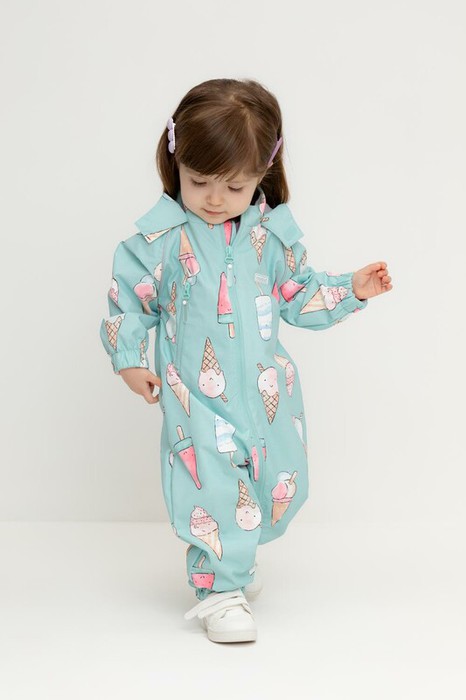 Ветровочный комбинезон ясельный из мембранной ткани с дополнительной тефлоновой обработкой. Данный вид обработки предохраняет изделие от загрязнения и лучше отводит влагу. Подклад из 100% хлопка. У изделия удлиненная молния для легкого одевания с защитой подбородка. Утяжка на капюшоне с потайными стопперами. По низу рукавов и брючин, а также на спинке изделия эластичная резинка для лучшего прилегания. Для фиксации комбинезона используются съемные силиконовые штрипки. В размерах  74-80 функциональные отвороты на рукавах и брючинах. Во всех изделиях верхнего ассортимента для безопасности ребенка предусмотрены светоотражающие элементы.