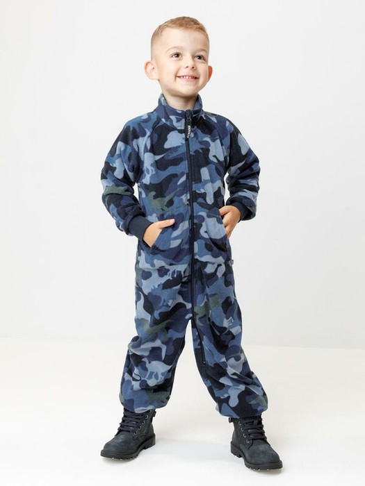 Флисовый комбинезон для мальчика с высоким воротником. Застёгивается на удлинённую молнию с мягкой защитой шеи и подбородка. Рукава и низ изделия на манжетах из  трикотажа в рубчик. Эластичная резинка по спинке обеспечивает идеальную посадку. Спереди удобный карман-кенгуру. Оригинальная набивка выполнена из стойких гипоаллергенных текстильных красителей. Комбинезон сохраняет цвет и форму после многократных стирок.