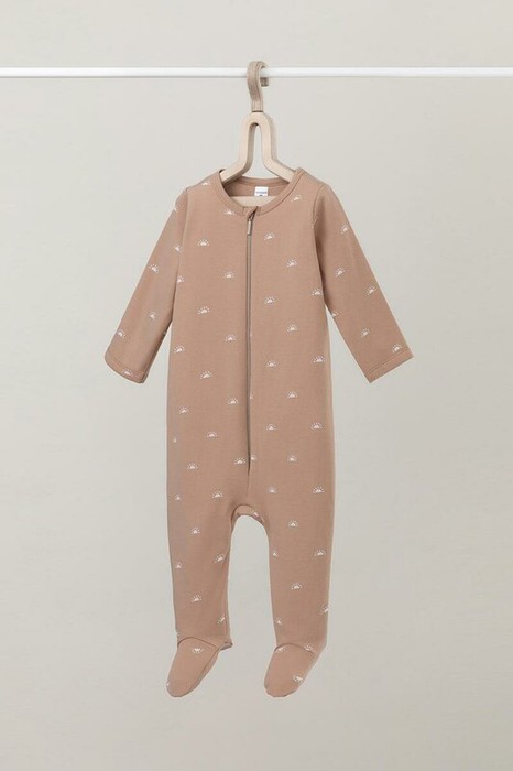 Комбинезон для новорождённых из тонкого трикотажа с начёсом, произведённого из натурального хлопка. Застёгивается спереди на молнию с защитой подбородка. Оригинальная набивка выполнена из стойких гипоаллергенных текстильных красителей. Все трикотажные полотна производятся в соответствии с нормами Швейцарского сертификата ЭкоТекс.