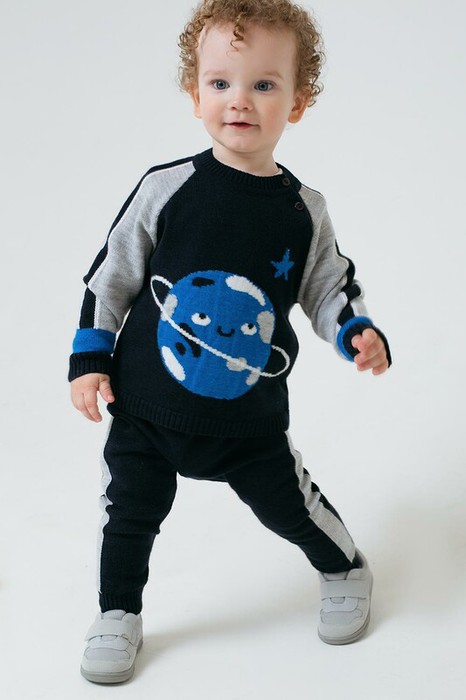 Вязаный комплект для мальчика: джемпер с круглой горловиной и брюки. Джемпер украшен вывязанным узором с изображением планеты и полосками на рукавах. Спереди на плече застёгивается на две пуговицы. Горловина, манжеты и пояс связаны ластиком. Брюки с эластичной резинкой в поясе украшены контрастными полосами по бокам, манжеты выполнены ластиком.