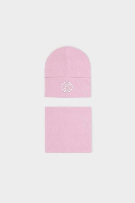 Комплект для девочки: шапка и снуд из хлопкового трикотажа в рубчик с добавлением эластана, окрашенного стойкими гипоаллергенными текстильными красителями. Изделия хорошо тянутся, после многократных стирок сохраняют цвет и форму.