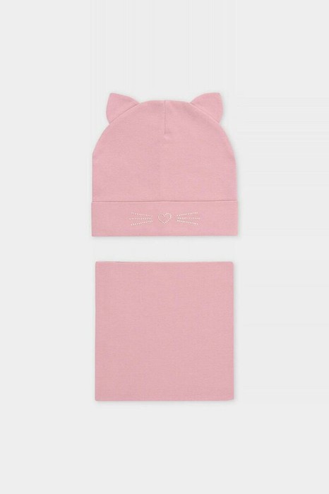 Комплект для девочки: шапка и снуд из хлопкового трикотажа с добавлением эластана, окрашенного стойкими гипоаллергенными текстильными красителями.  Изделия хорошо тянутся, после многократных стирок сохраняют цвет и форму.