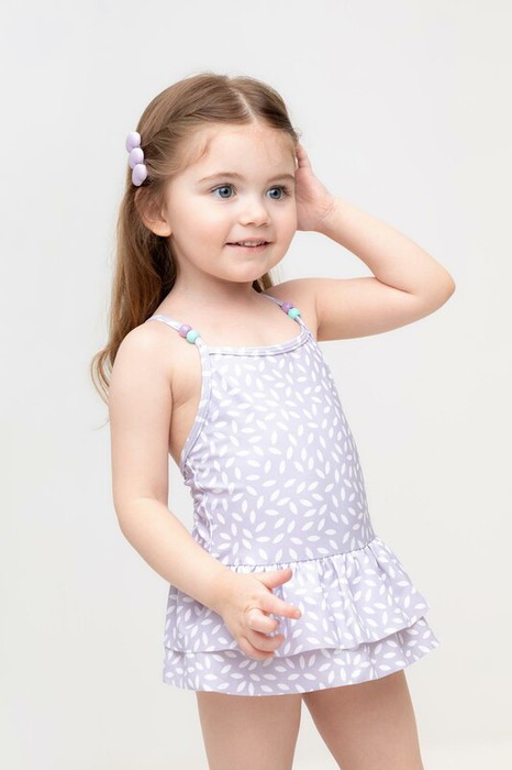 Слитный купальник на лямках для девочки. Украшен оборкой и декоративными пластиковыми шариками. Оригинальная набивка выполнена из стойких гипоаллергенных красителей.
