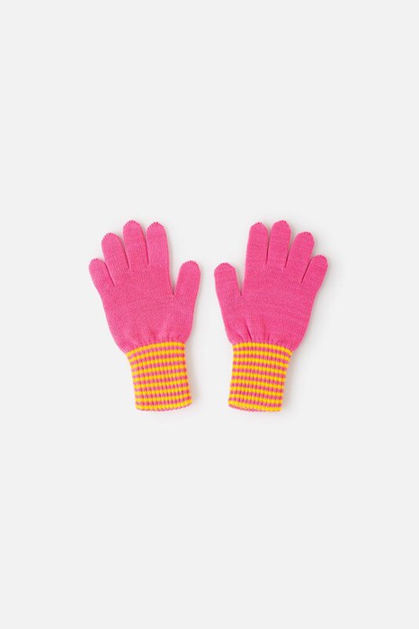 Вязаные перчатки из акриловой пряжи кораллового цвета с мягкими полосатыми манжетами. Широкие манжеты крепко фиксируют перчатку на руке.