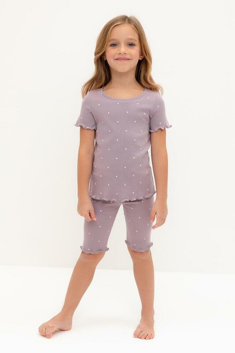 Трикотажная пижама в рубчик из натурального хлопка. Футболка с короткими втачными рукавами и шорты с эластичной резинкой в поясе. Оригинальная набивка выполнена из стойких текстильных гипоаллергенных красителей. Изделие сохраняет цвет и форму после многократных стирок. Все трикотажные полотна производятся в соответсвии с нормами швейцарского сертификата ЭкоТекс.