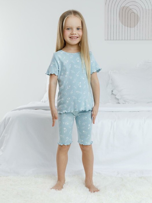 Трикотажная пижама в рубчик из натурального хлопка. Футболка с короткими втачными рукавами и шорты с эластичной резинкой в поясе. Оригинальная набивка выполнена из стойких текстильных гипоаллергенных красителей. Изделие сохраняет цвет и форму после многократных стирок. Все трикотажные полотна производятся в соответсвии с нормами швейцарского сертификата ЭкоТекс.