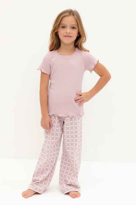 Трикотажная пижама из натурального хлопка. Футболка с короткими втачными рукавами изготовлена из эластичного трикотажа в рубчик. Брюки с эластичной резинкой в поясе выполнены из гладкого трикотажа супрем. Оригинальная набивка выполнена из стойких текстильных гипоаллергенных красителей. Изделие сохраняет цвет и форму после многократных стирок. Все трикотажные полотна производятся в соответсвии с нормами швейцарского сертификата ЭкоТекс.