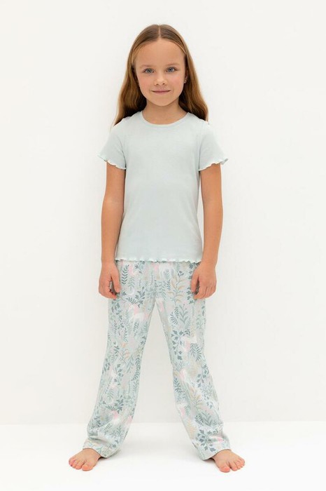 Трикотажная пижама из натурального хлопка. Футболка с короткими втачными рукавами изготовлена из эластичного трикотажа в рубчик. Брюки с эластичной резинкой в поясе выполнены из гладкого трикотажа супрем. Оригинальная набивка выполнена из стойких текстильных гипоаллергенных красителей. Изделие сохраняет цвет и форму после многократных стирок. Все трикотажные полотна производятся в соответсвии с нормами швейцарского сертификата ЭкоТекс.