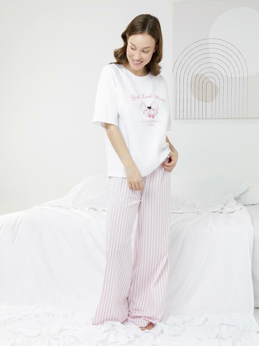 Трикотажная пижама из натурального хлопка для комфортного сна и отдыха. Свободная футболка с короткими спущенными рукавами и широкие брюки с мягкой эластичной резинкой в поясе. Гладкий материал приятен к телу, не теряет форму и позволяет коже дышать. Оригинальный принт и набивка выполнены из стойких текстильных гипоаллергенных красителей. Все трикотажные полотна производятся в соответствии с нормами швейцарского сертификата ЭкоТекс.