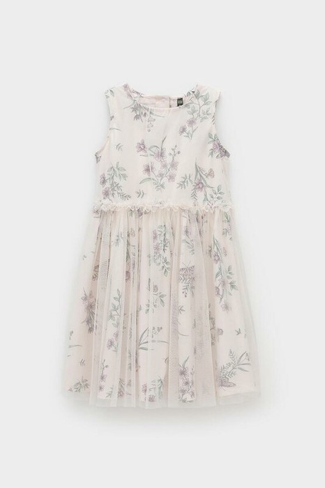 Легкое нарядное платье для девочки из высококачественного трикотажа, верхний слой - из сетки. Застёгивается на спинке с помощью кнопок. Оригинальная набивка выполнена из стойких текстильных гипоаллергенных красителей. Изделие сохраняет цвет и форму после многократных стирок.