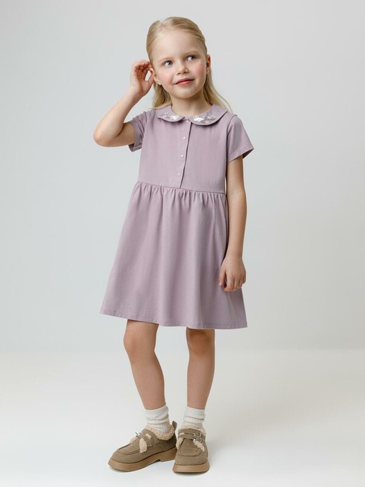 Платье для девочки с короткими рукавами из гладкого хлопкового трикотажа. Украшено вышивкой на воротничке. Для удобства одевания спереди застёгивается на кнопки. Платье сохраняет форму и стойкий цвет после многочисленных стирок и идеально подходит на каждый день. Все трикотажные полотна производятся в соответствии с нормами швейцарского сертификата ЭкоТекс.