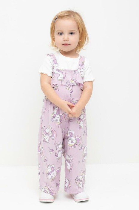 Комбинезон на лямках для девочки. Удобная застежка на кнопки спереди. Оригинальная набивка выполнена из стойких текстильных гипоаллергенных красителей. Изделие сохраняет цвет и форму после многократных стирок.