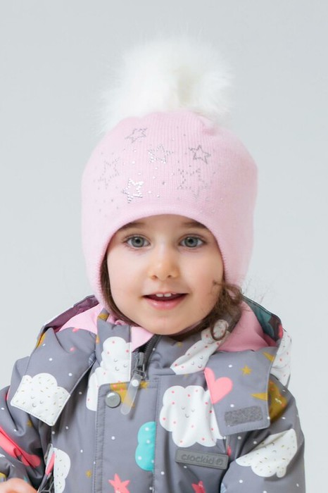 Светло-розовая шапка из полушерти на завязках. Внутри - утеплитель Fellex® (60 г/м2) и мягкая подкладка из трикотажа интерлок. Украшена меховым помпоном на макушке и блестящими стразами.