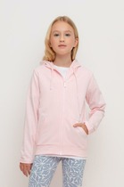 Трикотажная куртка с капюшоном для девочки из петельчатого футера. Спереди удобные накладные карманы, манжеты и пояс из основного полотна.