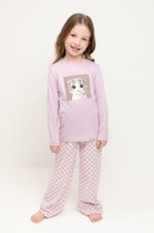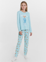 Трикотажный пижамный комплект из натурального хлопка. У джемпера длинные втачные рукава. Брюки с удобным поясом на резинке и утягивающим плетеным шнуром. Оригинальная набивка выполнена из стойких, гипоаллергенных текстильных красителей. Все трикотажные полотна производятся в соответствии с нормами Швейцарского сертификата ЭкоТекс.