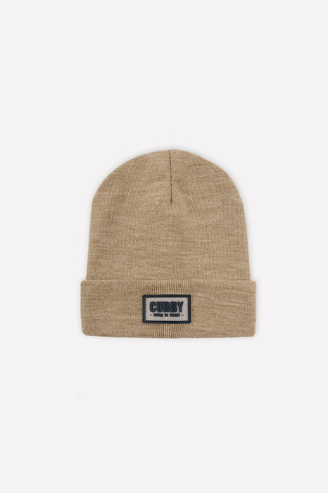 Тёплая вязаная шапка бежевого цвета для девочки. На отвороте прикреплена нашивка с названием бренда CUBBY.