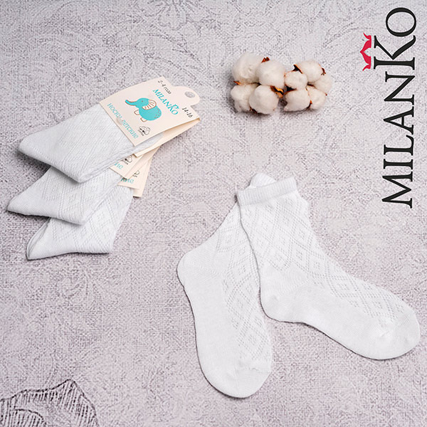 Детские белые носки в мелкую сетку из очищенной хлопковой нити в сочетании с эластаном. Применены экологически чистые красители! В упаковке 4 пары(шт).