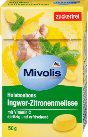 Конфеты для горла Mivolis без сахара, имбирная мелисса с подсластителями и витамином С имеют особенно приятный вкус благодаря ценным экстрактам 18 трав.